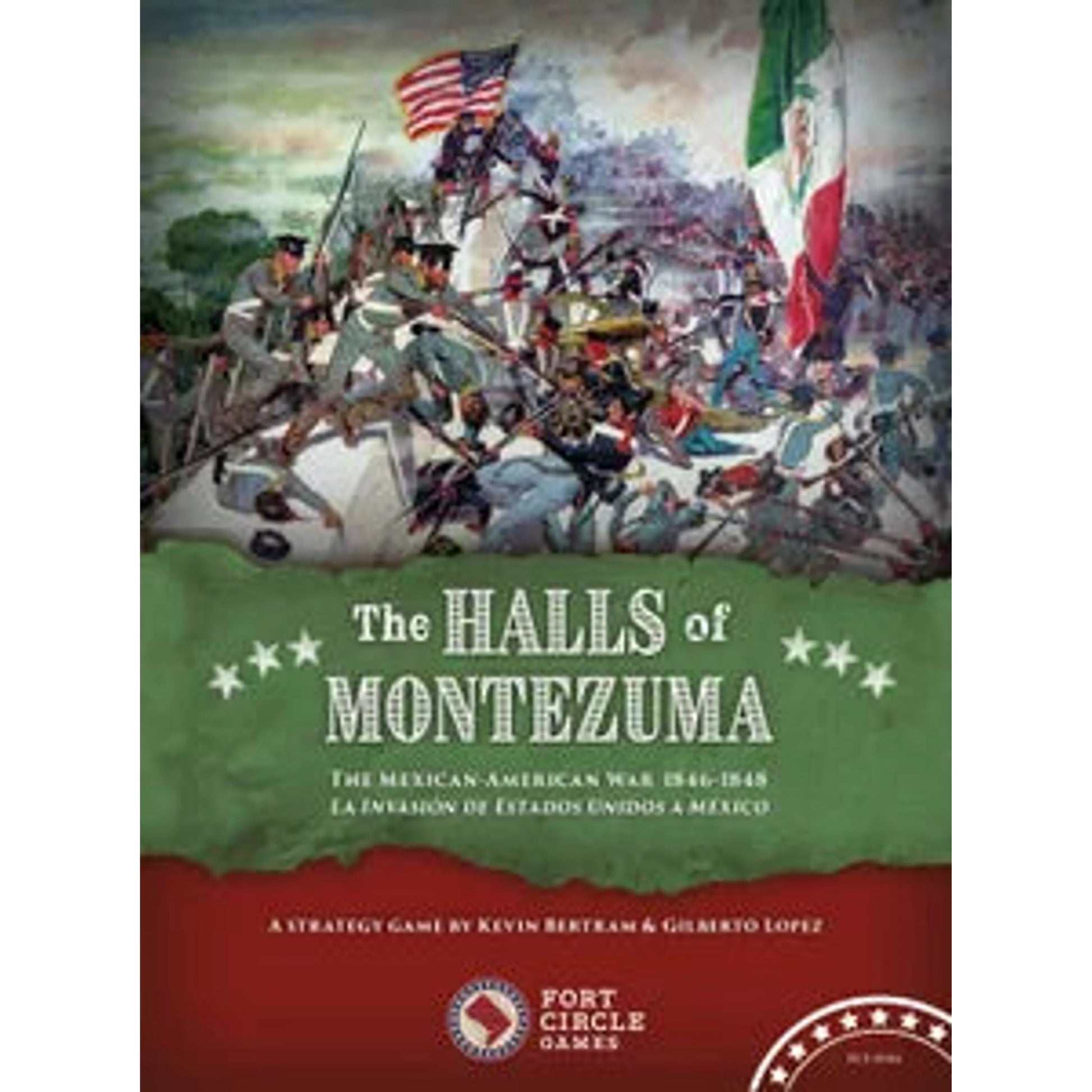 The Halls of Montezuma, designed by Kevin Bertram and Gilberto Lopez, tasks one or two players (or teams of players) to recreate this vital but overlooked part of American history. As the "American" player, you are the Polk Administration - working with Congress to pass treaties and your legislative agenda while prosecuting the war against Mexico. As the "Mexican" player, you control all of the forces opposing the Polk Administration - not only the Mexican government and Mexican army, but also the Whig Party, the nascent American anti-war movement, fierce Apache and Comanche warriors, and even Mother Nature in the form of bad weather and devastating diseases.