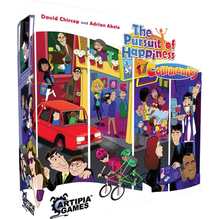 In Community, the first expansion for The Pursuit of Happiness, players have the chance to engage in various community-related events and choose their outcome, affecting their popularity within the community. Community includes a new side game board for the local Community, providing space for the new Community Deck and Popularity track.